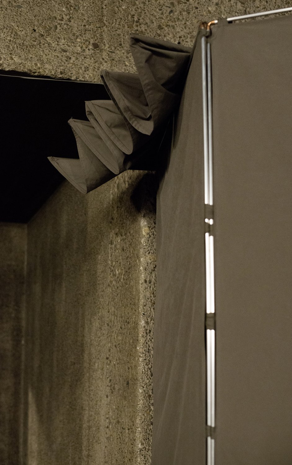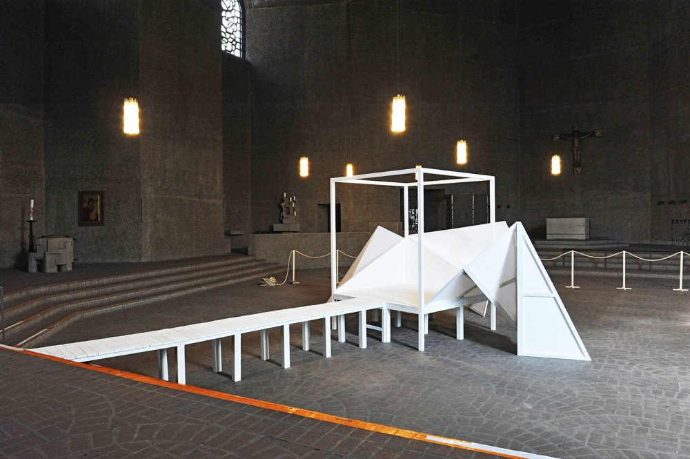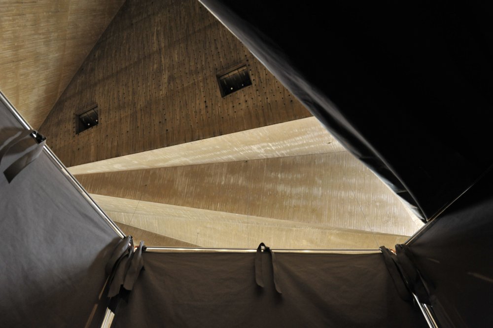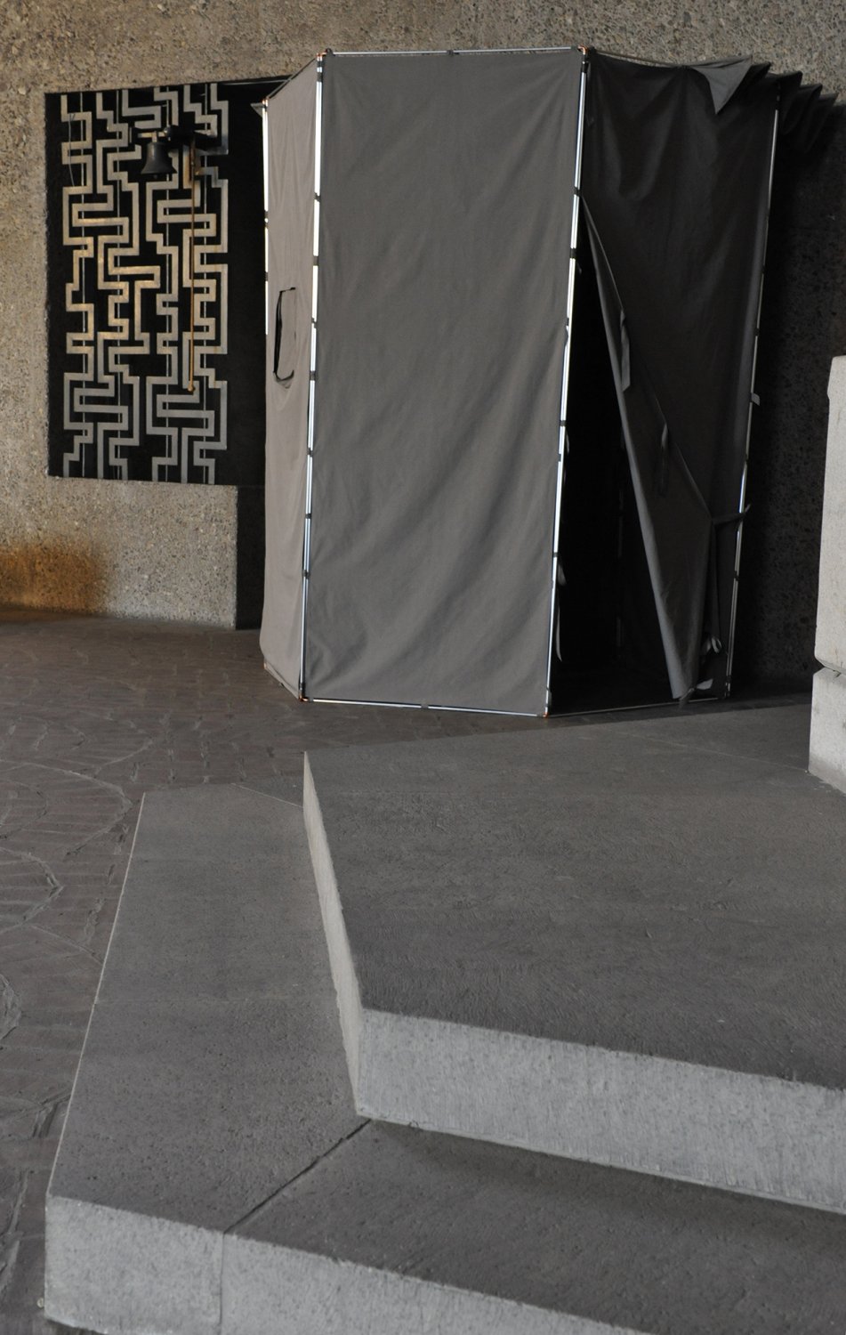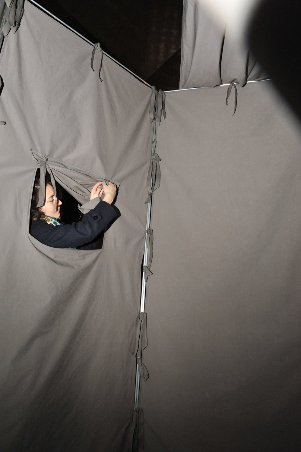 Ma contribution, une installation qui tient de la tente et de la cabane, est une structure en aluminium et tissu, modulable et facile à transporter. Elle constitue un poste d'observation qui se fond dans la couleur du béton et se déplace à volonté afin de mieux s'approprier l'imposant bâtiment conçu par Gottfried Böhm au début des années 60.