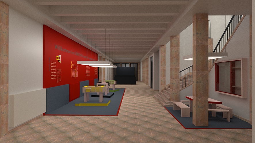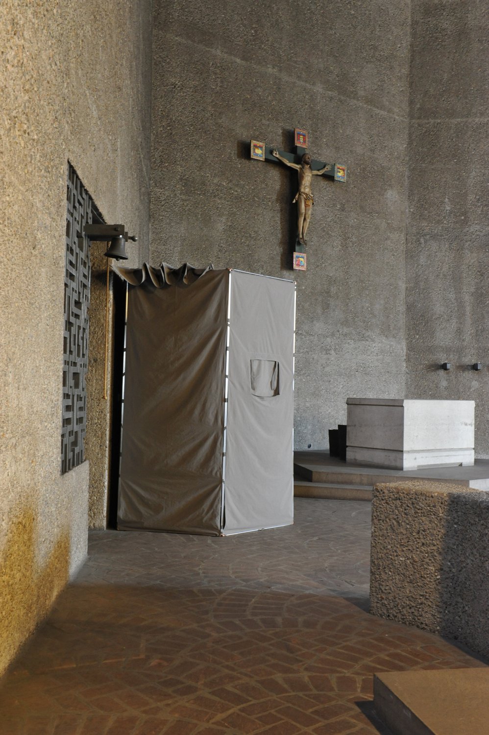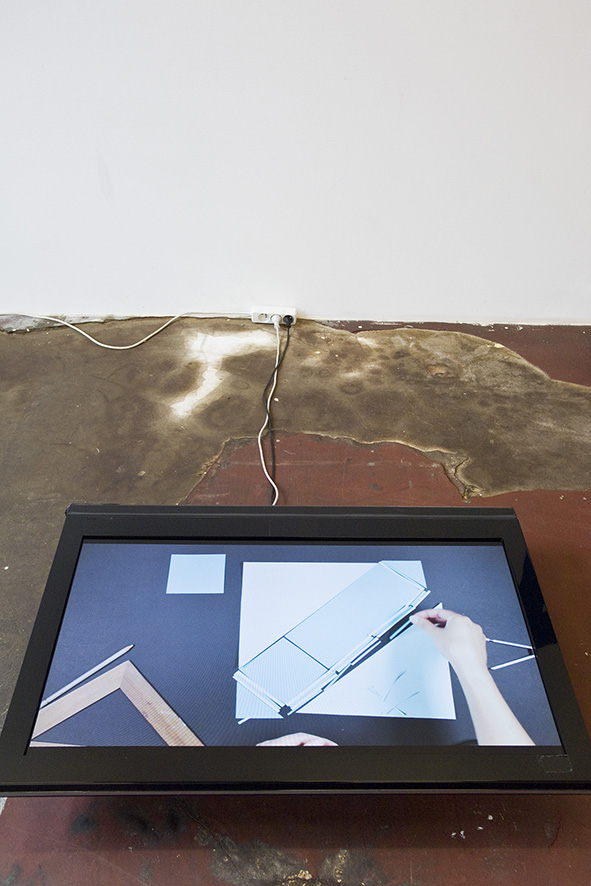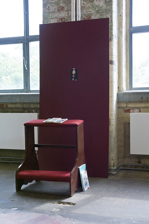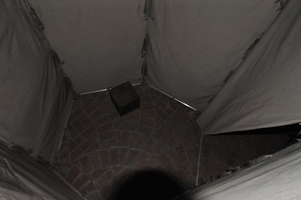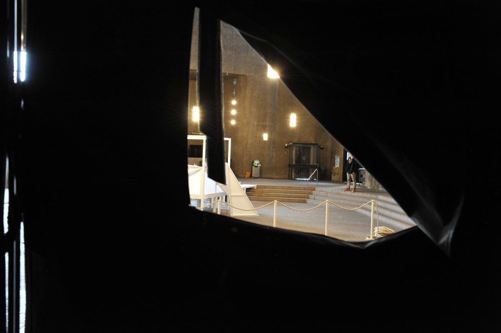 Ma contribution, une installation qui tient de la tente et de la cabane, est une structure en aluminium et tissu, modulable et facile à transporter. Elle constitue un poste d'observation qui se fond dans la couleur du béton et se déplace à volonté afin de mieux s'approprier l'imposant bâtiment conçu par Gottfried Böhm au début des années 60.